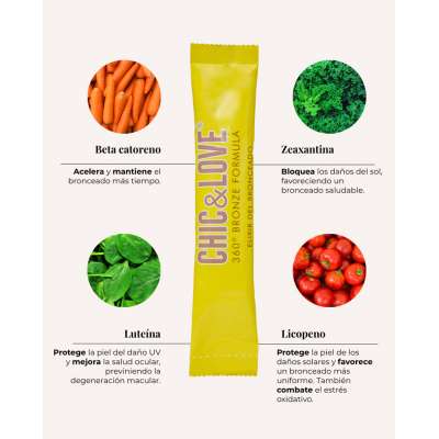 Chic&Love Bronze Sticks 360 es el aliado ideal para preparar tu piel antes del sol, potenciar un tono bronceado más bonito y ayudar a mantenerlo por más tiempo. Su formato en viales bebibles hace que cuidarte sea fácil, rápido y delicioso, integrándose sin esfuerzo en tu rutina diaria.