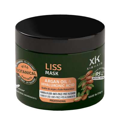 La Liss Mascarilla con Aceite de Argán y Ácido Hialurónico de Xik Hair es un tratamiento intensivo diseñado para hidratar, reparar y controlar el encrespamiento, especialmente en cabellos lisos, rebeldes o sometidos a tratamientos de alisado.