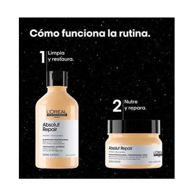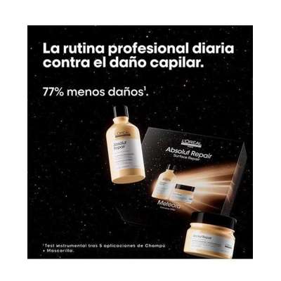 - Mascarilla L’Oréal Serie Expert Absolut Repair 250ml. Formulada con proteína de quinoa dorada que repara y nutre las partes debilitadas o dañadas de la fibra capilar, consiguiendo un pelo mucho más suave, brilloso, fuerte y sin sensación de pesadez.