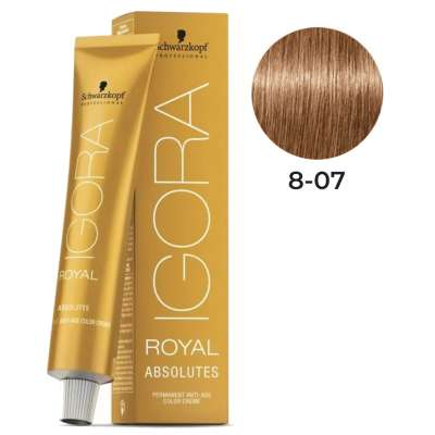 Igora Royal Absolutes Age Blend 8.07 Rubio Muy Claro Chocolate Natural es una coloración permanente profesional especialmente desarrollada para cubrir las necesidades del cabello maduro y con canas, ofreciendo resultados de color excepcionales junto con un cuidado avanzado. Gracias a su exclusivo Complejo Pro-Age, enriquecido con siliamina y colágeno, esta fórmula no solo garantiza una cobertura del 100 % de las canas, sino que también fortalece y protege la fibra capilar durante el proceso de coloración.