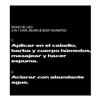 Aplicar sobre el cabello, barba y cuerpo húmedos. Masajear suavemente hasta crear espuma y aclarar con abundante agua.