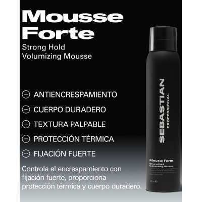 La Mousse Forte Voluminizadora de Sebastian Specialists es una espuma profesional diseñada para aportar fijación fuerte, volumen duradero y control del encrespamiento en todo tipo de cabello.